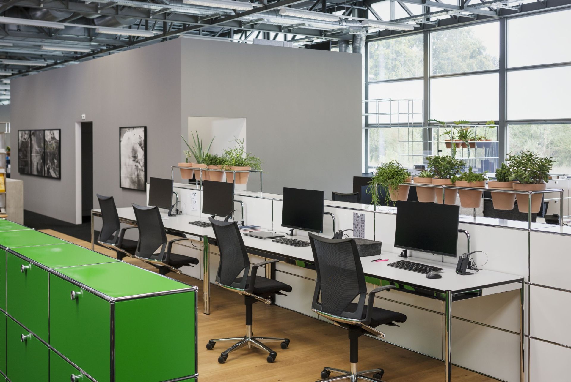 Auch im Büro oder im Open-Office sorgt die Pflanzenwelt von USM für Wohlbefinden. Als Sichtschutz zwischen Arbeitsplätzen, zur Raumtrennung oder im Lounge Bereich, die Pflanzen bringen eine angenehme Arbeitsatmosphäre in den grauen Büroalltag.