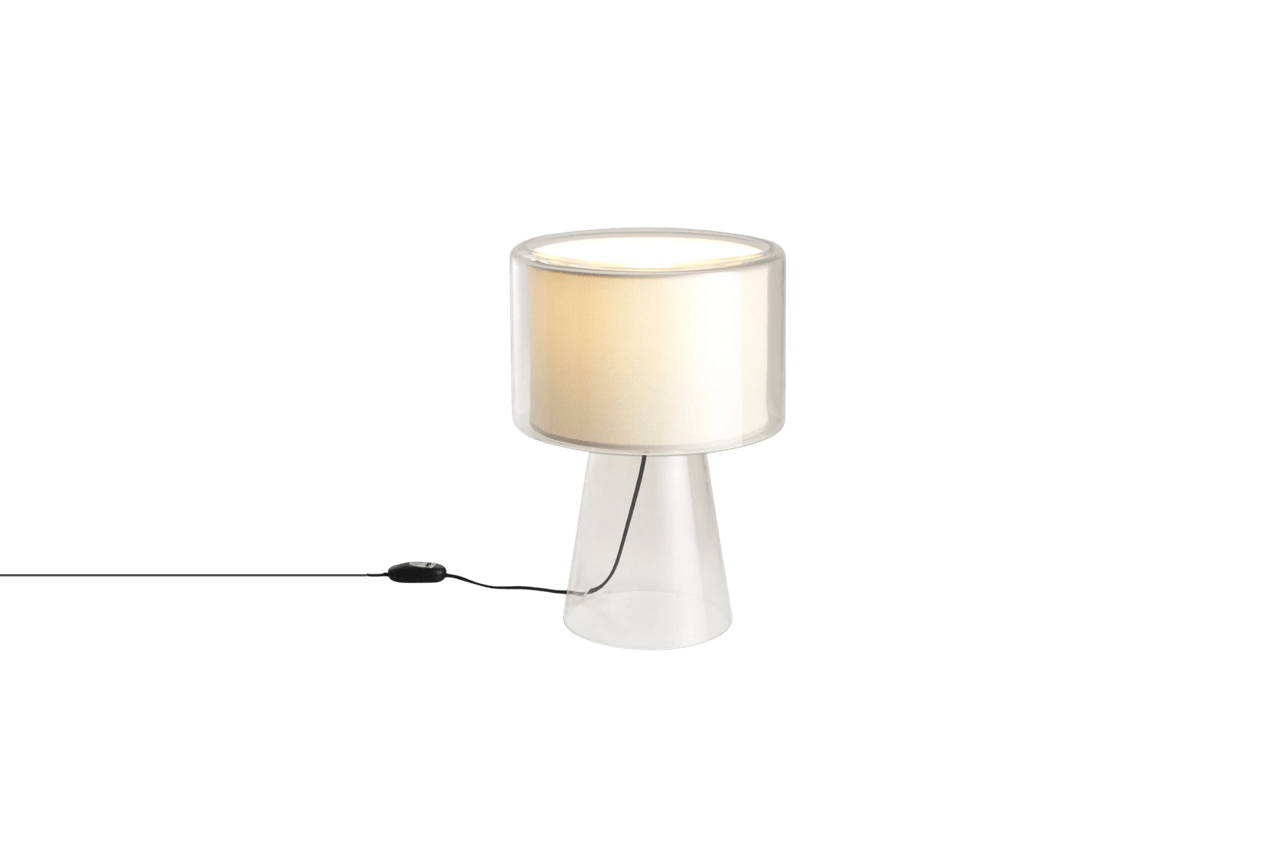 Die Mercer Tischleuchte kombiniert einen schwebend wirkenden Stoffschirm mit mundgeblasenem Glas und sorgt für eine harmonische, sanfte Beleuchtung. Ihre schlichte Eleganz macht sie zu einem stilvollen Blickfang.