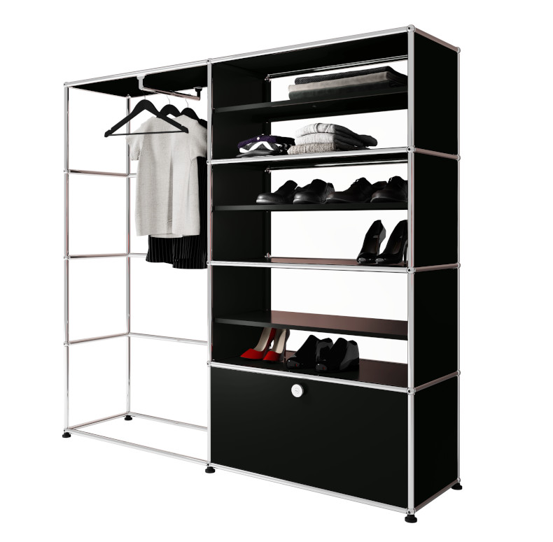 Eine USM Haller Garderobe ist eine stilvolle und funktionale Möglichkeit, um Kleidung, Accessoires, Schuhe u.v.m. zu organisieren und aufzubewahren. Die Garderobe kann mit unterschiedlichen Elementen wie Auszugtüren, Klapptüren oder Schubladen ausgestattet werden. So können Jacken, Mäntel, Schuhe und andere Gegenstände platzsparend und übersichtlich aufbewahrt werden. Über unseren Konfigurator kannst du deine persönliche Garderobe in verschiedenen Größen und Farben selbst konfigurieren, teste es selbst - zum Konfigurator.