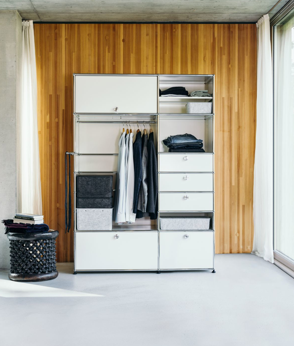 Es bietet sich sowohl die offene Lösung an, als auch Kombinationen aus offenen und geschlossenen Elementen. Damit lassen Sie all die Kleinigkeiten verschwinden, die sonst offen herumliegen. Geschickt geplant, lässt das USM Haller Element die eigentliche Garderobe sogar komplett verschwinden, indem es als Raumteiler konzipiert wird und noch zusätzlichen Stauraum schafft.